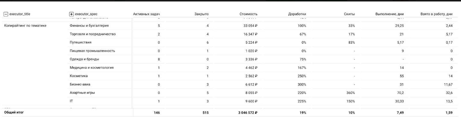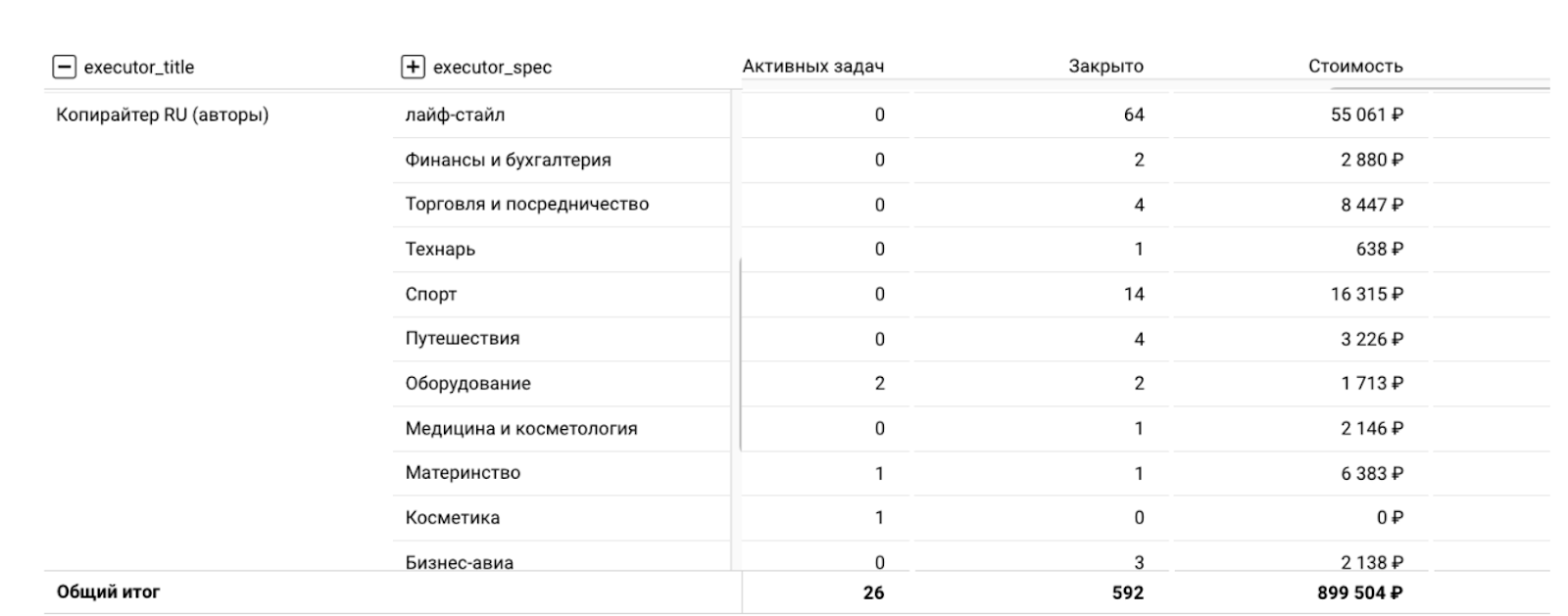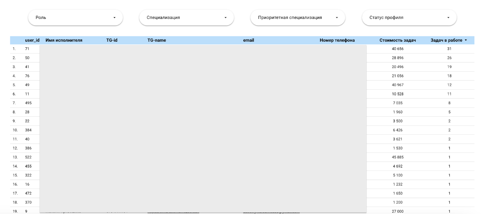Просматривайте количество и стоимость задач по исполнителям, чтобы не допустить перегрузку одного специалиста.