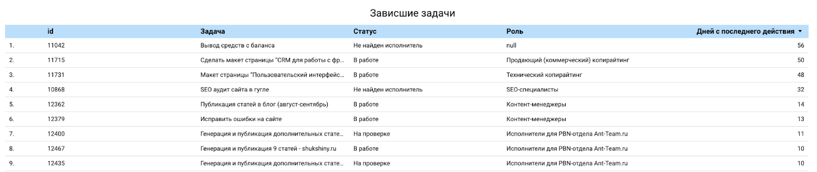 Анализируйте «зависшие» задачи, чтобы оперативно устранить проблему. Срыв сроков не станет неожиданностью.