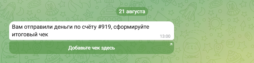 Счет отражается в профиле бухгалтера и оплачивается. Специалист запрашивает чек через уведомление в Телеграме.